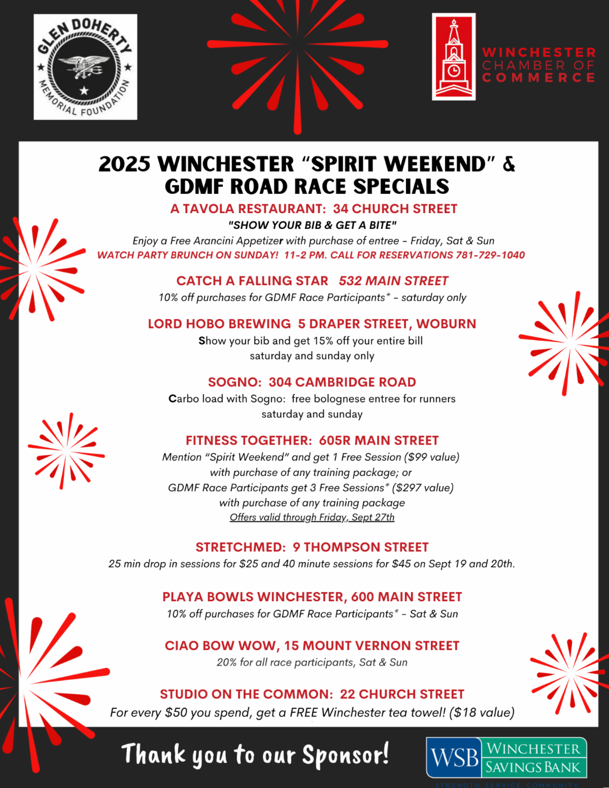 The Winchester Chamber of Commerce, in partnership with The Glen Doherty Memorial Foundation, have organized Spirit Weekend 2025 for the weekend of September 19-21st. The weekend has now become an annual event where the community comes together to not only honor Winchester’s hometown hero, Glen Doherty, but also to celebrate the unique spirit of Winchester. The Chamber invites all residents of Winchester and beyond to plan for a great weekend of local shopping, dining and celebrating! Thank you to Winchester Savings Bank for sponsoring the weekend!